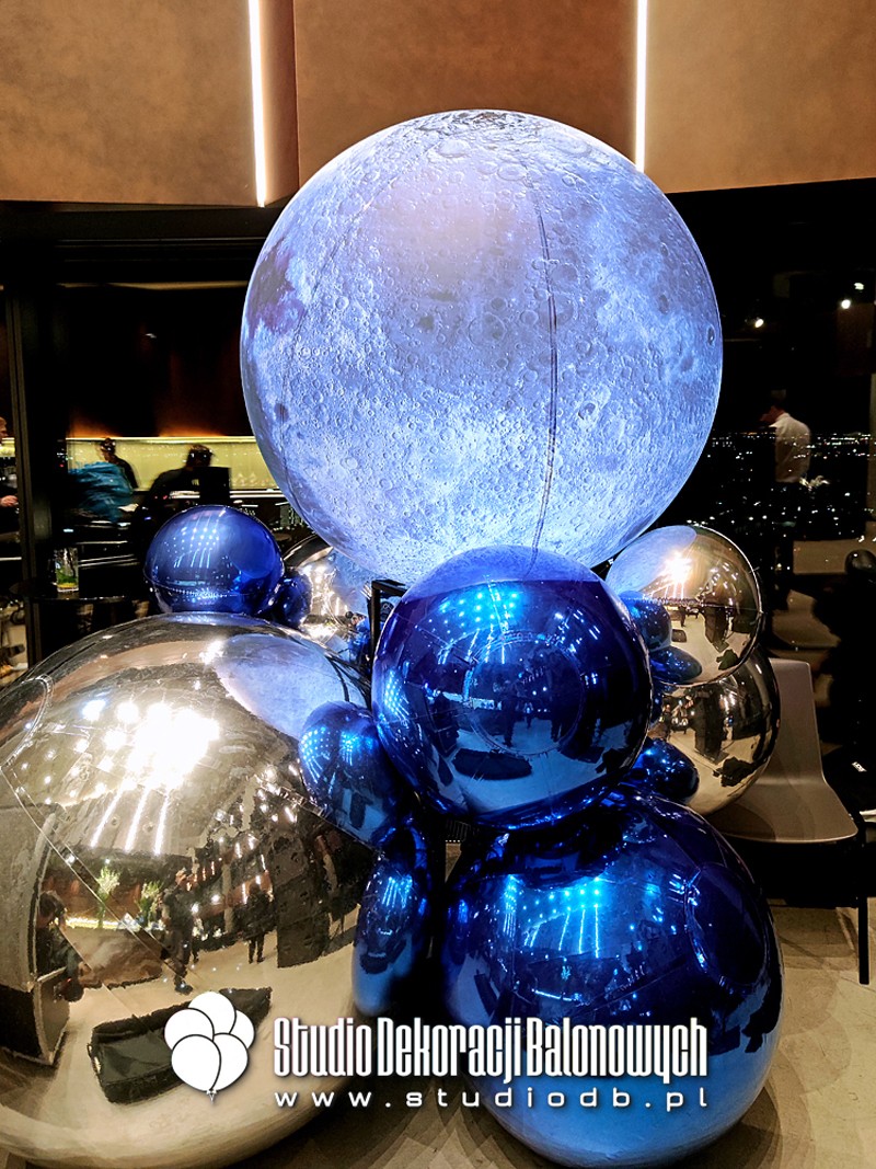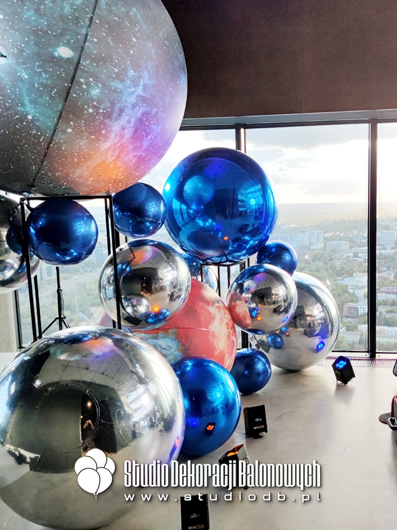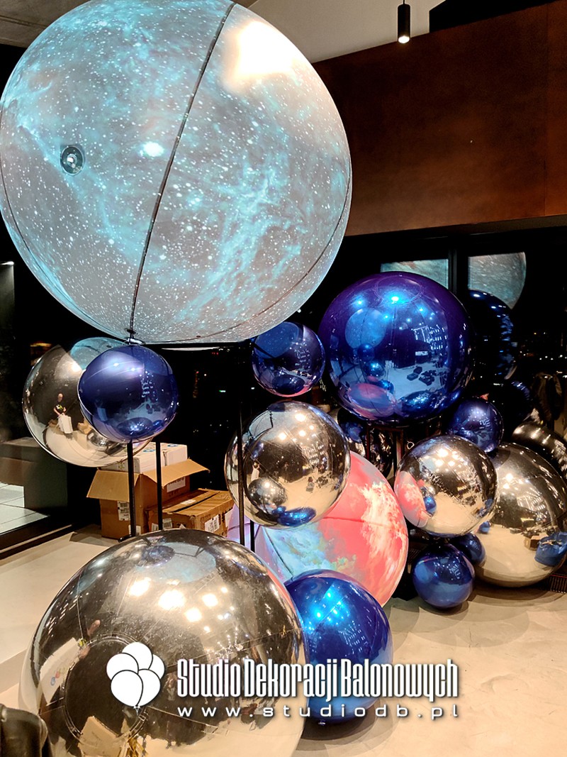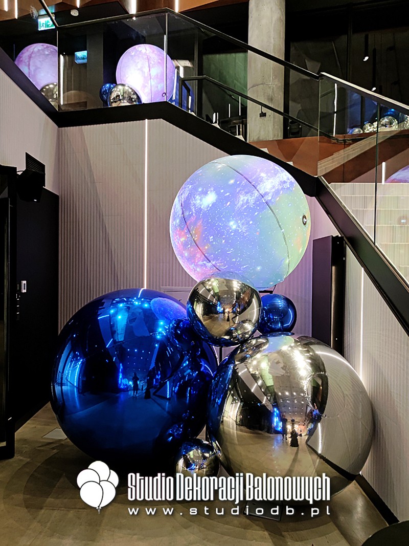 Kompozycje z balonów o błyszczącej i metalicznej powierzchni ułożone w przestrzenne, futurystyczne formy. Doskonale zgrały się z oświetleniem oraz szklaną architekturą wnętrza, tworząc niepowtarzalny klimat galaktycznej podróży.