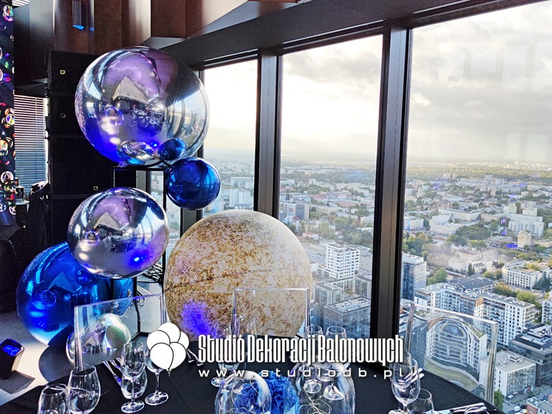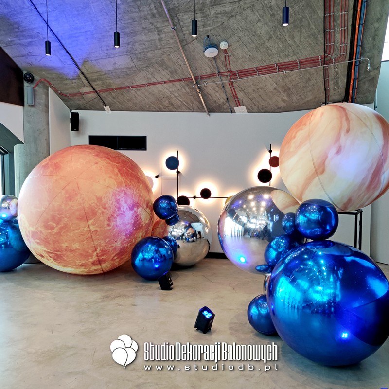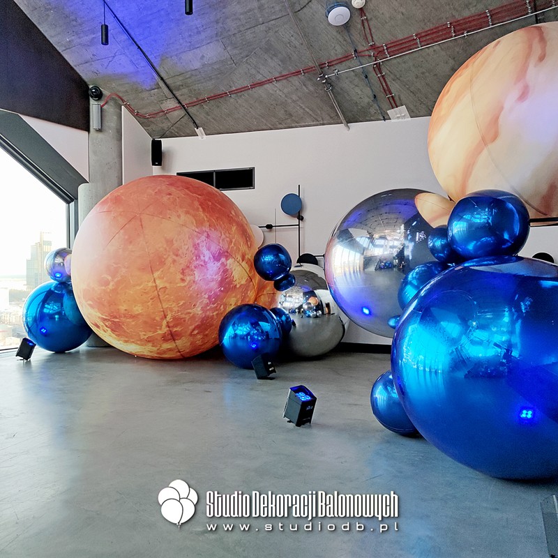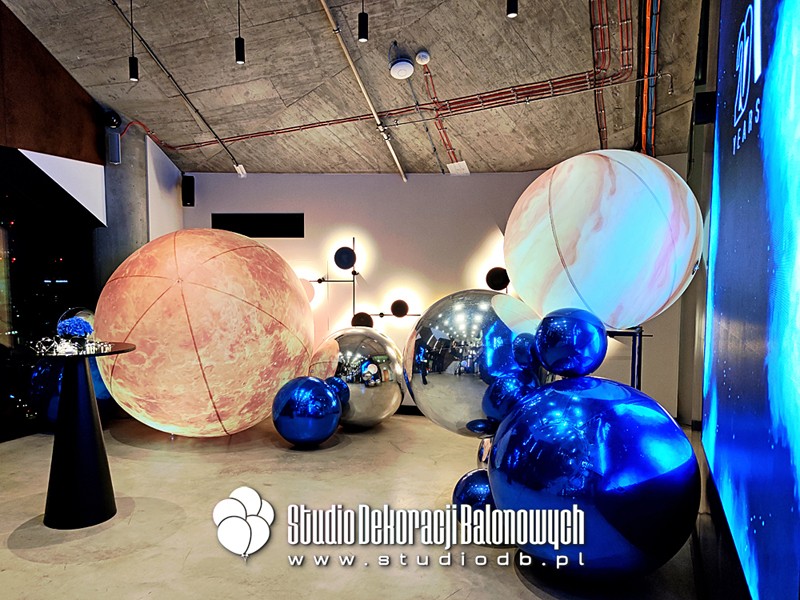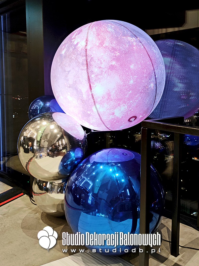 Kompozycje z balonów o błyszczącej i metalicznej powierzchni ułożone w przestrzenne, futurystyczne formy. Doskonale zgrały się z oświetleniem oraz szklaną architekturą wnętrza, tworząc niepowtarzalny klimat galaktycznej podróży.