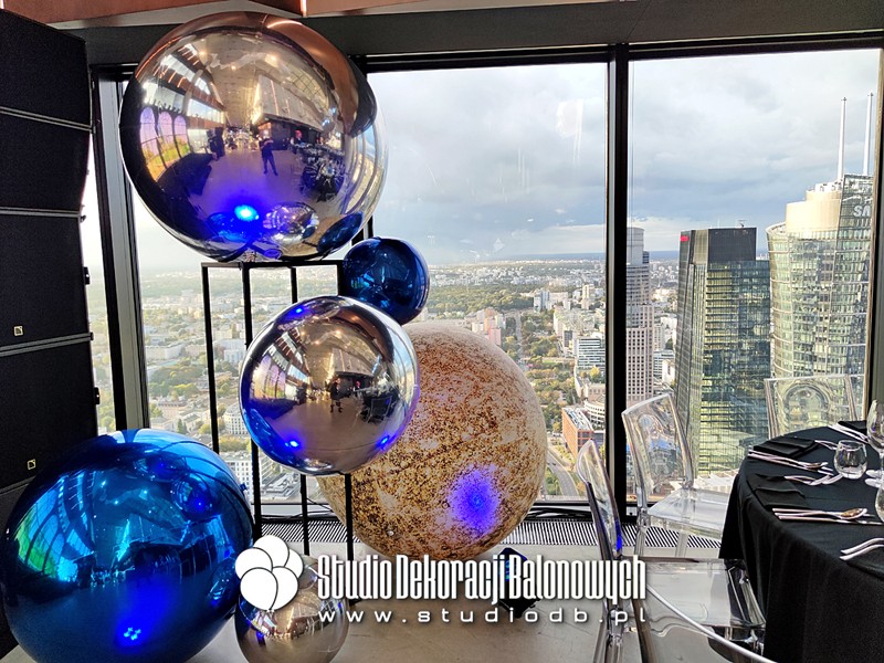 Chromowane kule w różnych rozmiarach (od 30 cm do ponad 1 metra) w odcieniach srebra i metalicznego błękitu. Ich powierzchnia odbijała światła eventowe oraz otoczenie, dodając głębi i nowoczesności całej aranżacji.